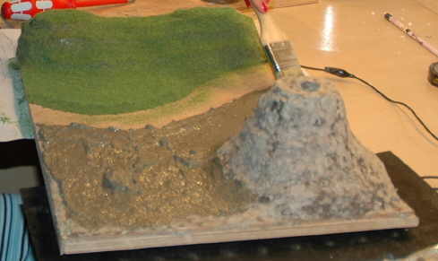 5. Wir haben eine Abtönfarbe, Farbton Umbra auf die Hügel, den Vulkan und die Wiese gestrichen damit das Kunstgras von Heki aus dem Modelbau darin kleben bleibt.