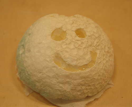 9. Als neunten und letzten Schritt kommt nun das Iglo. Dafür haben wir einfach eine Styroporkugel zerschnitten. Falls du keine zuhause hast, die gibt es in vielen Bastelläden billig zu kaufen. Zum Aufkleben haben wir den Bastelkleber Ponal verwendet. Den Smily den du oben siehst, war die andere Hälfte und soll zeigen was passiert wenn man versucht Styropor mit Heißkleber auf Holz zu befestigen. *grins* Lass den Ponal Kleber gut trocknen. Fertig ist das Kunstwerk!