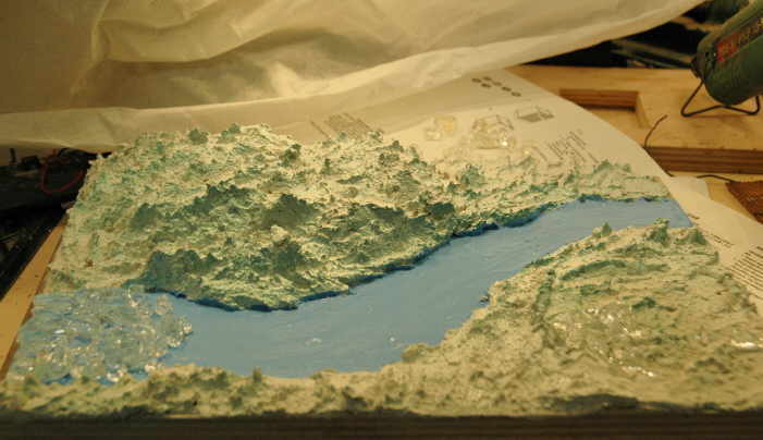 4. Rühre nun etwas Gips an und forme ihn so, wie du es willst. Wichtig ist, auf den Fluss darf KEIN Gips. Damit die Hügel so kanntig werden und aussehen wie Gebirge musst du einfach nur mit einem flachen Gegenstand (wir haben einen Spachtel benutzt) in den Gips stechen. (Du kannst anstatt Gips natürlich auch Pappmachee nehmen, aber es dauert viel länger zu trocknen. Gehen würde es aber warscheinlich schon.)