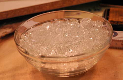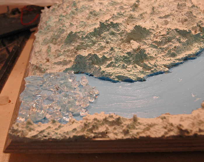 8. Nun kommen die Eisschollen auf den Fluss. Oben hast du ein Bild gesehen, von ganz vielen kleinen Glasstückchen die mal drei Schüsseln waren... Du musst natürlich keine Schüssel zerstören, aber vielleicht hast du ja irgendwo kleine Glasstückchen. Falls ja, nimm dir einen Heißkleber und klebe die Stückchen damit auf dem Holz fest. Dabei musst du schnell sein, denn der Heißkleber trocknet rasch! (Falls du gar keine Glasstückchen hast, kannst du sie auch weglassen, aber es sieht halt schöner aus, wenn welche da sind.) ;)